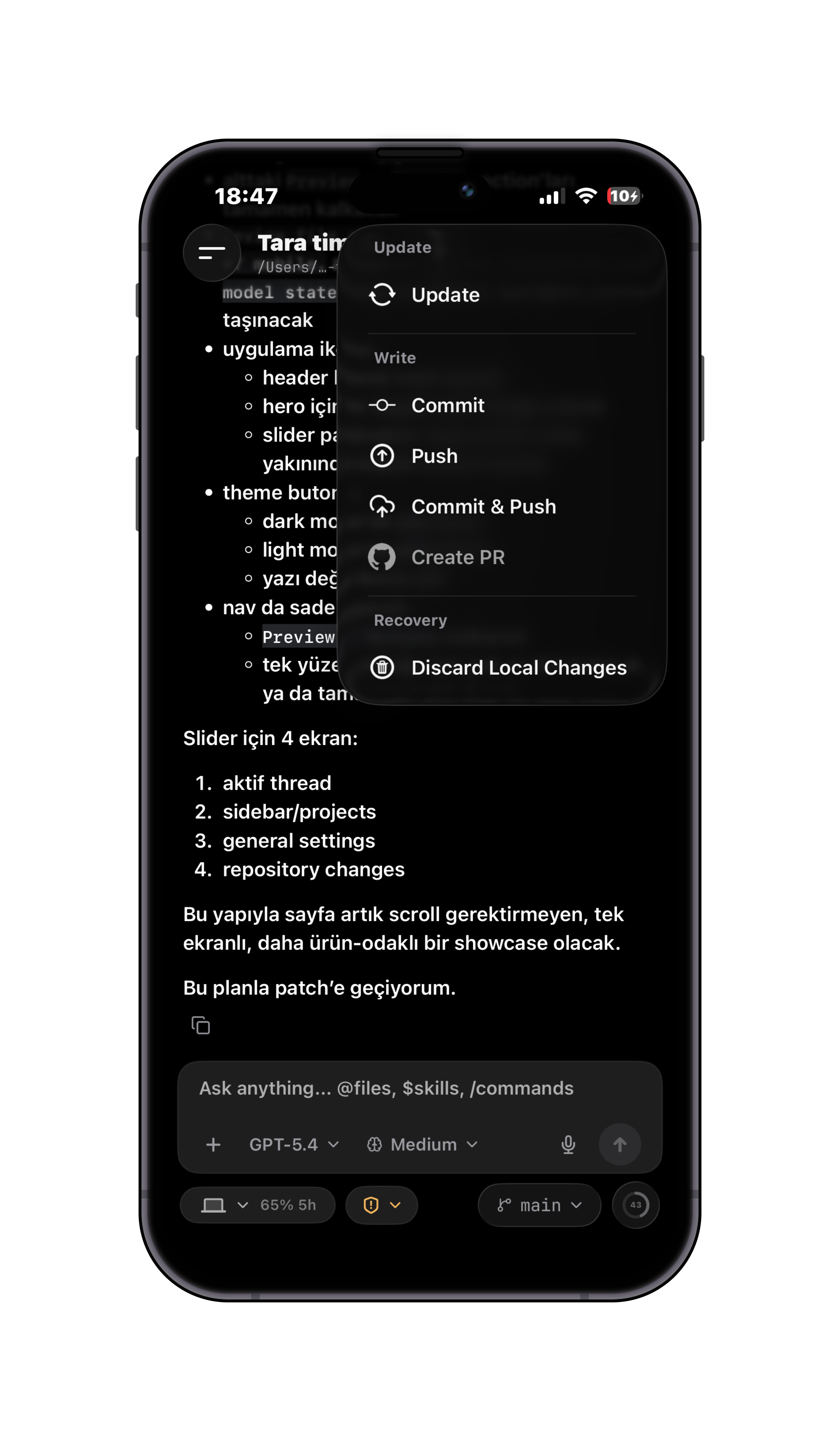 Update, commit, push, and PR actions can surface from the same mobile runtime instead of sending you back to the Mac.